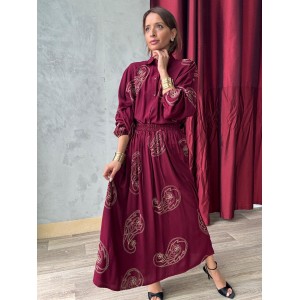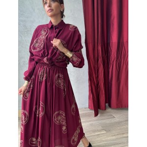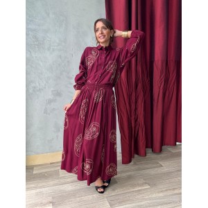 Cet ensemble deux pièces incarne l’élégance bohème avec une touche raffinée. Confectionné dans un tissu fluide et léger, il se compose d'une chemise boutonnée à manches longues et d'une jupe longue taille élastiquée. Les motifs dorés façon paisley apportent un charme chic et ethnique qui le rend idéal pour toutes les occasions : brunch, sortie chic ou soirée estivale.